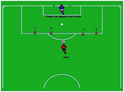 Un portiere è tra i pali gli altri compagni sono al limite dell’area ciascuno su un cono numerato.