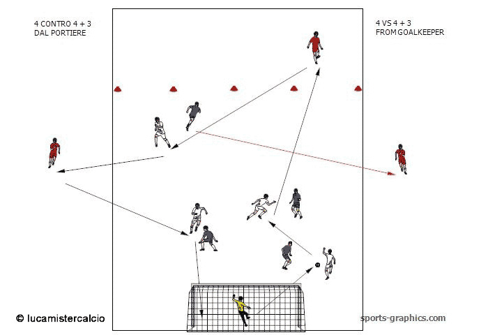 Goalkeeper decides the first possession team passing the ball (white team here); they must be able to pass the ball to the center free player after at least one pass among them. The center free player starts the attacking move then. Scores are now valid only after a wall pass with outside free players (black arrows). If defending team wins the ball, goal can be score even only after a wall pass and an outside free player. Goalkeeper always starts new moves.